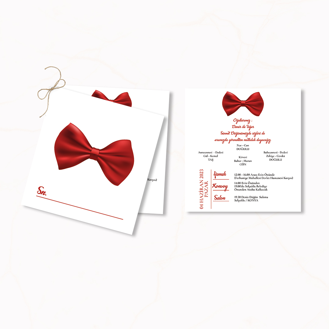Davetiyeler 15x16 cm ebatlarındadır. A. Bristol 250 Gr. Kağıt. Ön ve arka olmak üzere iki adet davetiyeden oluşur. Davetiyelerin arkasında baskı yoktur. Görselde görünen baskılar iki ayrı baskı şeklinde gelecektir. Davetiyeler sol üstten delinmiş şekilde gönderilir. Beraberinde ücretsiz olarak gönderdiğimiz iplerle bağlanmaktadır. Davetiye aksesuarları ve zarf fiyata dahildir. Diğer Ekonomik Davetiye modellerimize ilgili kategoriden ulaşabilirsiniz.